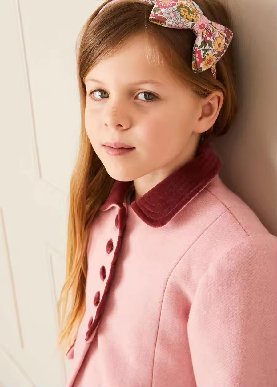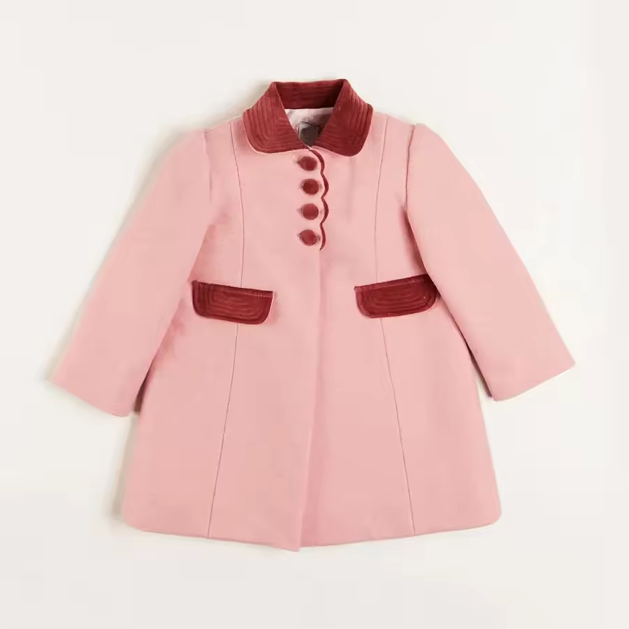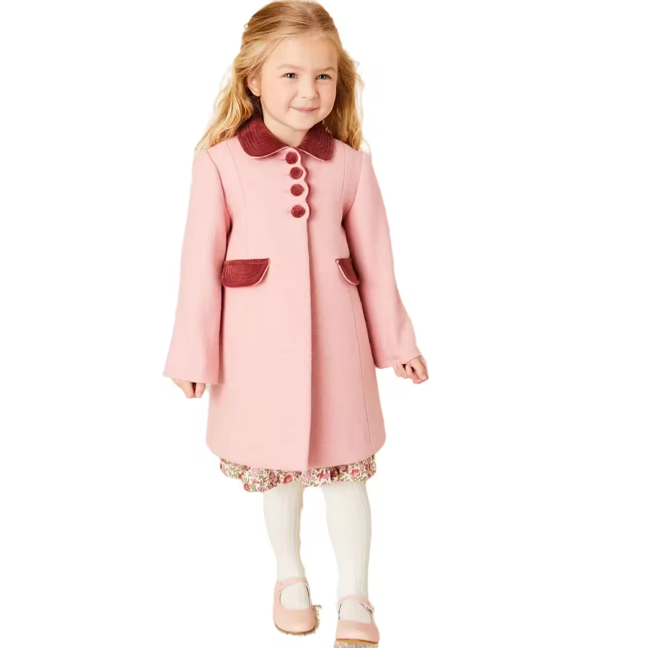 Customizable Long Winter Coat for Girls Woolen Pink Dress with Red Collar and Pocket Small Size Long Outwear