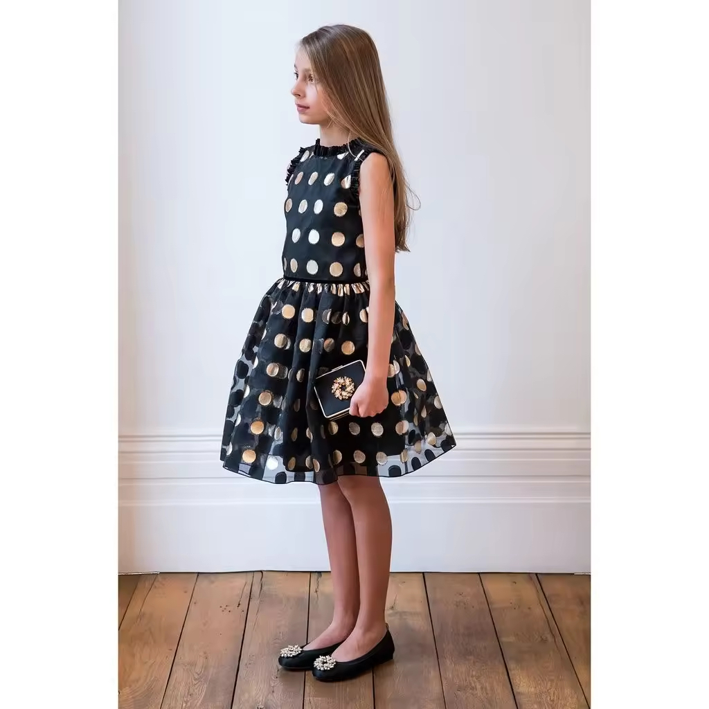 Custom 2024 Elegant Black Lace Children Girls Dresses With Gold Dot Boutique Baby Girl Dress for Party Ball Grown Kids Clothing
