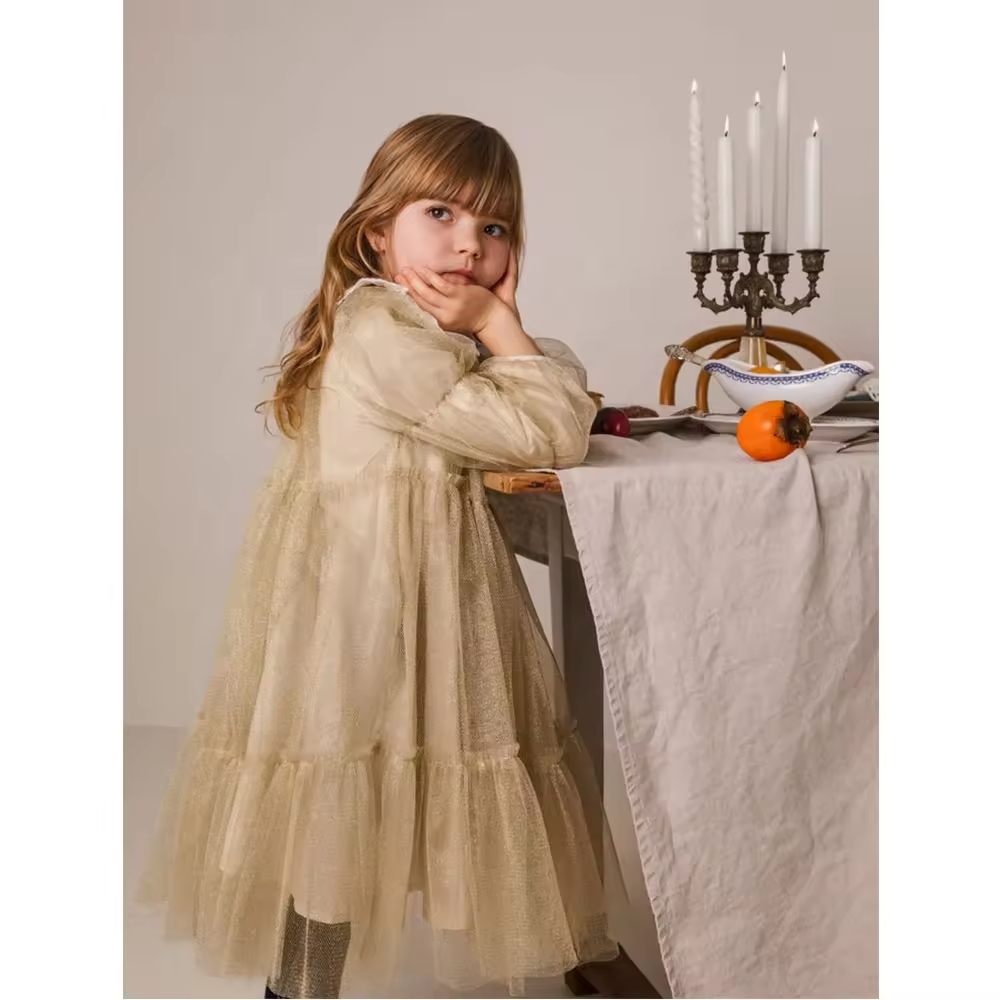 Custom Spring Gold Lace Long Sleeve Tulle Boutique Girls Birthday Party Dresses Toddler Kids Clothing Children Outfit 2-12 Y