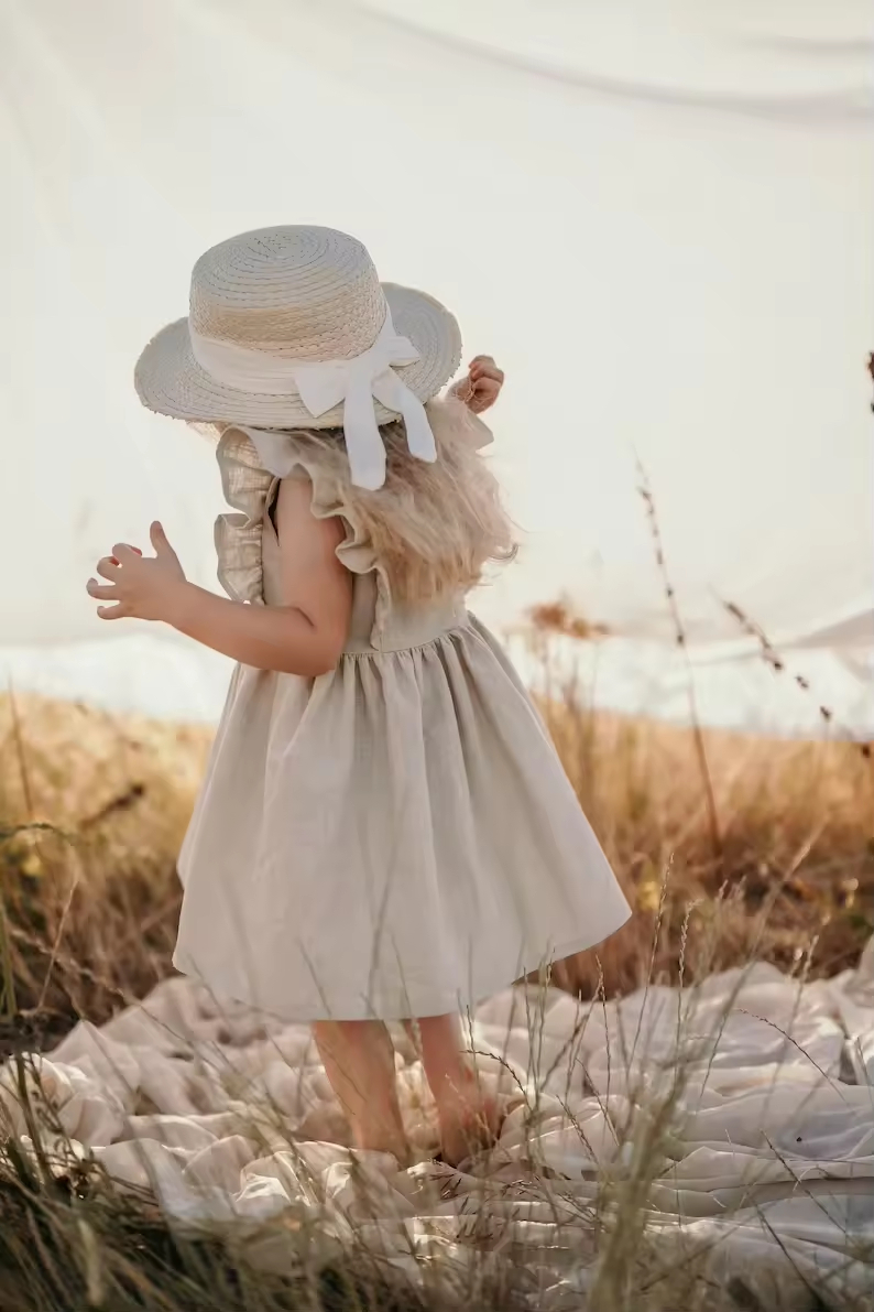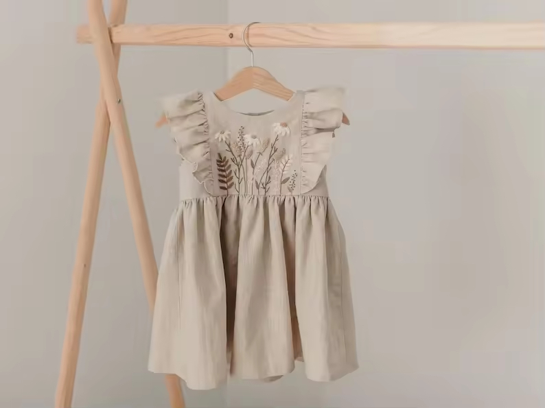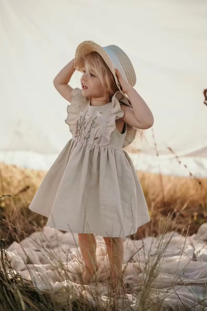 Custom Logo Made Fashion Kids Girls Dress Natural Beige Flutter Sleeves Baby Girl Linen Dress With Handmade Embroidery