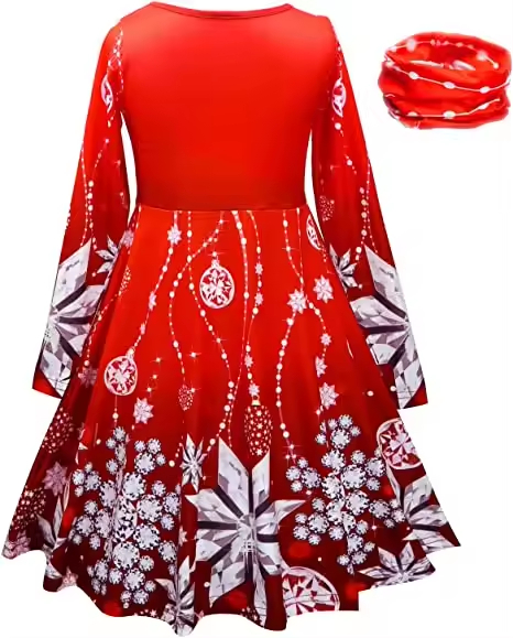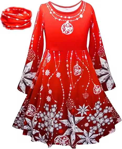 Hot Selling Kids Clothing Long Sleeve Baby Girl Dresses in White Red for Children Christmas Snowflake Printing O-Neck Collar
