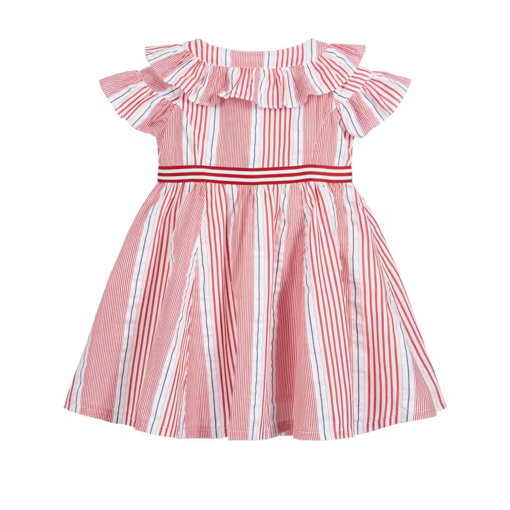 Customized Newest Design Buttons Front Ruffles Collar Dresses Kids Woven Cotton Yarn Dyed pink White Stripes Girl Dress