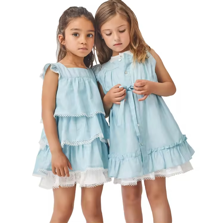 OEM Customized Girls Dress New Design Summer Casual Style for Kids Children Clothes Solid Pattern Ruffle Decoration Wholesale