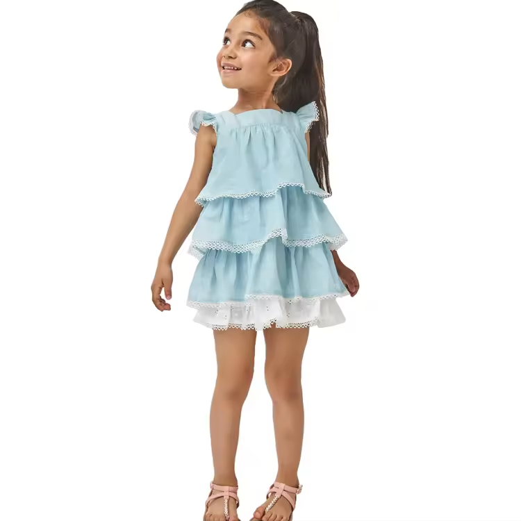 /Best Selling Boutique Newest Design Petal Sleeve Fashion Summer Dress Baby Blue Beautiful Lace Toddler Dresses for Girls